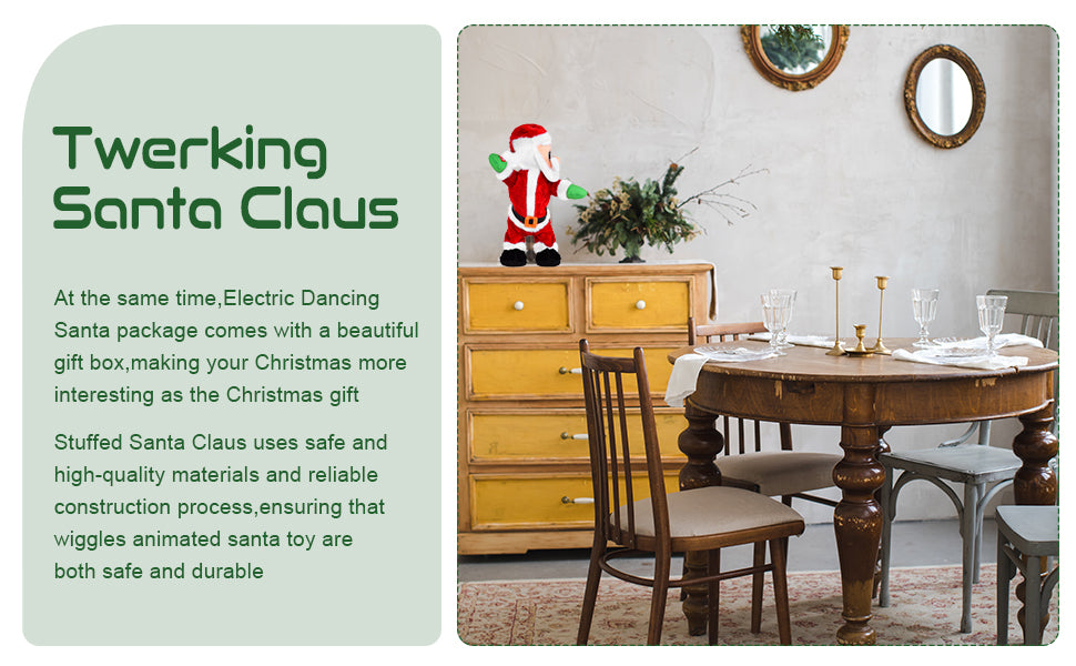 • 【Easy to Operation】Just install 3 * AA batteries at Santa Claus's feet and turn on the switch on tweaking twisted hip Santa Claus's right hand,Dancing Santa Claus will start performing,which is a wonderful XMAS funny gift for kids. (Battery not included).