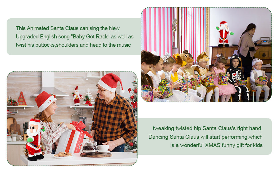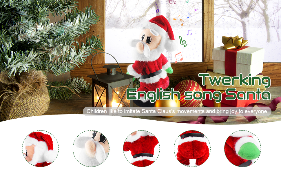 • 【Twerking English song Santa】This Animated Santa Claus can sing the New Upgraded English song "Baby Got Rack" as well as twist his buttocks,shoulders and head to the music. Children like to imitate Santa Claus's movements and bring joy to everyone.